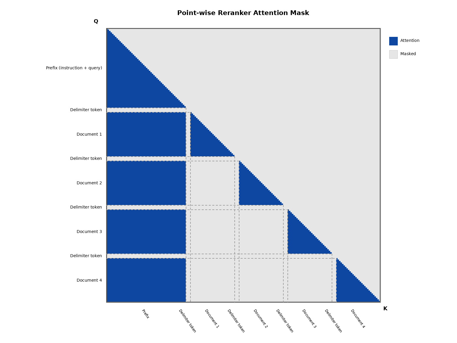 Here's how it works: we concatenate multiple (query, document) pairs into a single packed sequence, separated by a delimiter token. We then modify the attention mask so that tokens within each pair attend only to each other, while attention to tokens from other pairs is masked out entirely. This produces a block-diagonal attention pattern (see diagram below) — each document is scored in isolation, but we amortize the overhead of a model call across many pairs at once.