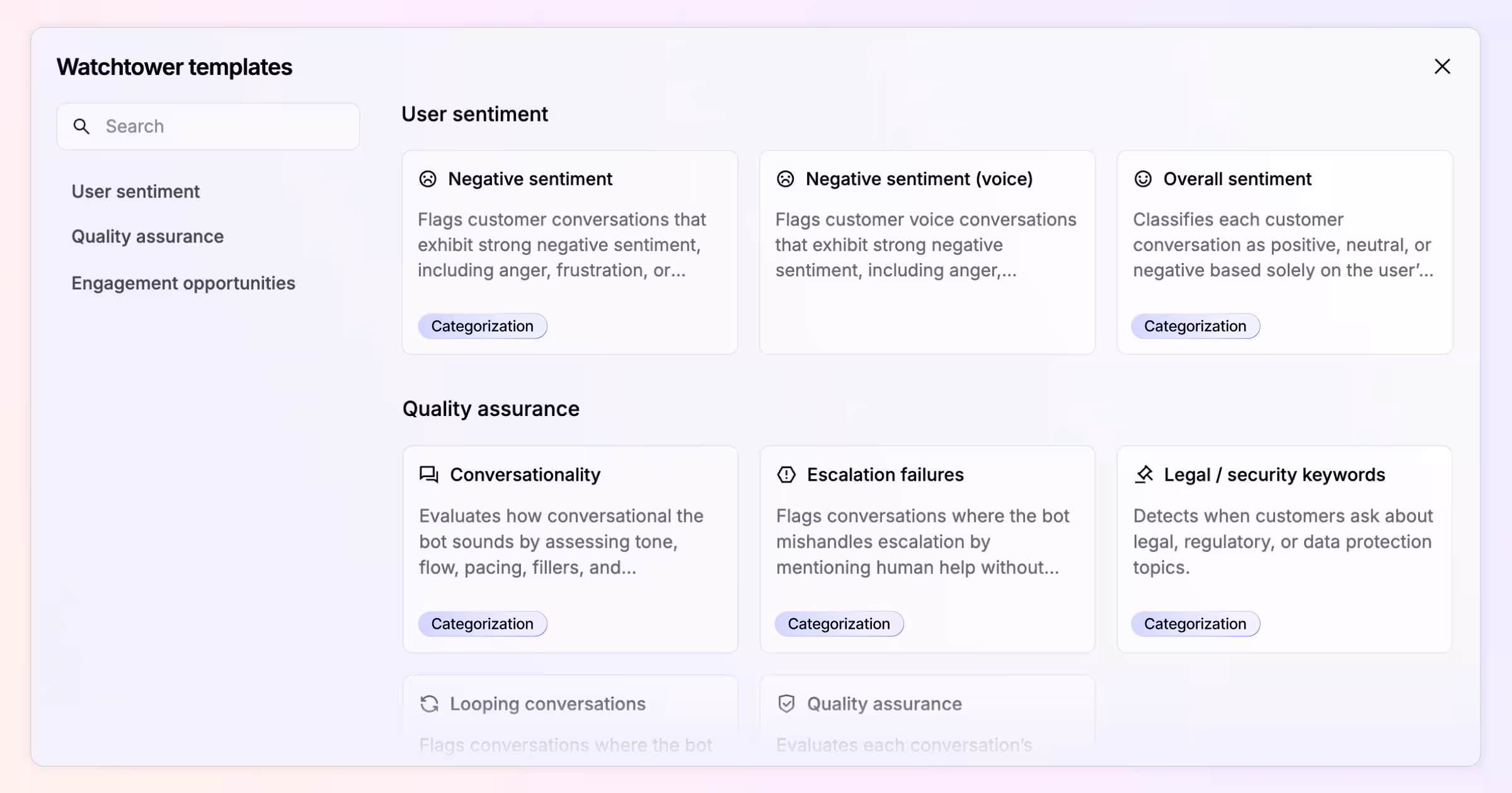 Watchtower gives you always-on monitoring and quality assurance across every customer conversation, with the flexibility to define custom criteria in natural language and track exactly what matters to your business. With endless possibilities for what you can monitor, Watchtower templates provide a faster path forward by packaging the most valuable QA configurations for you.
