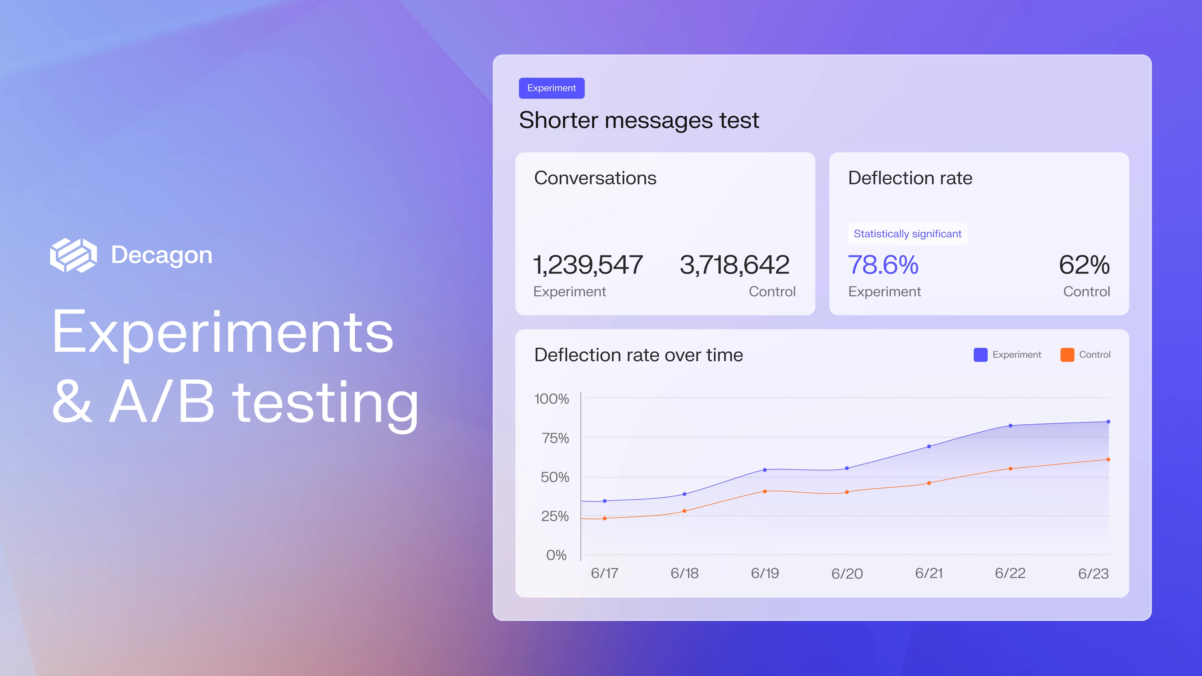 Decagon’s experimentation suite makes this process approachable for CX teams. Running multiple experiments? Decagon automatically reserves at least 20% of traffic as a control baseline, ensuring clean comparisons.
