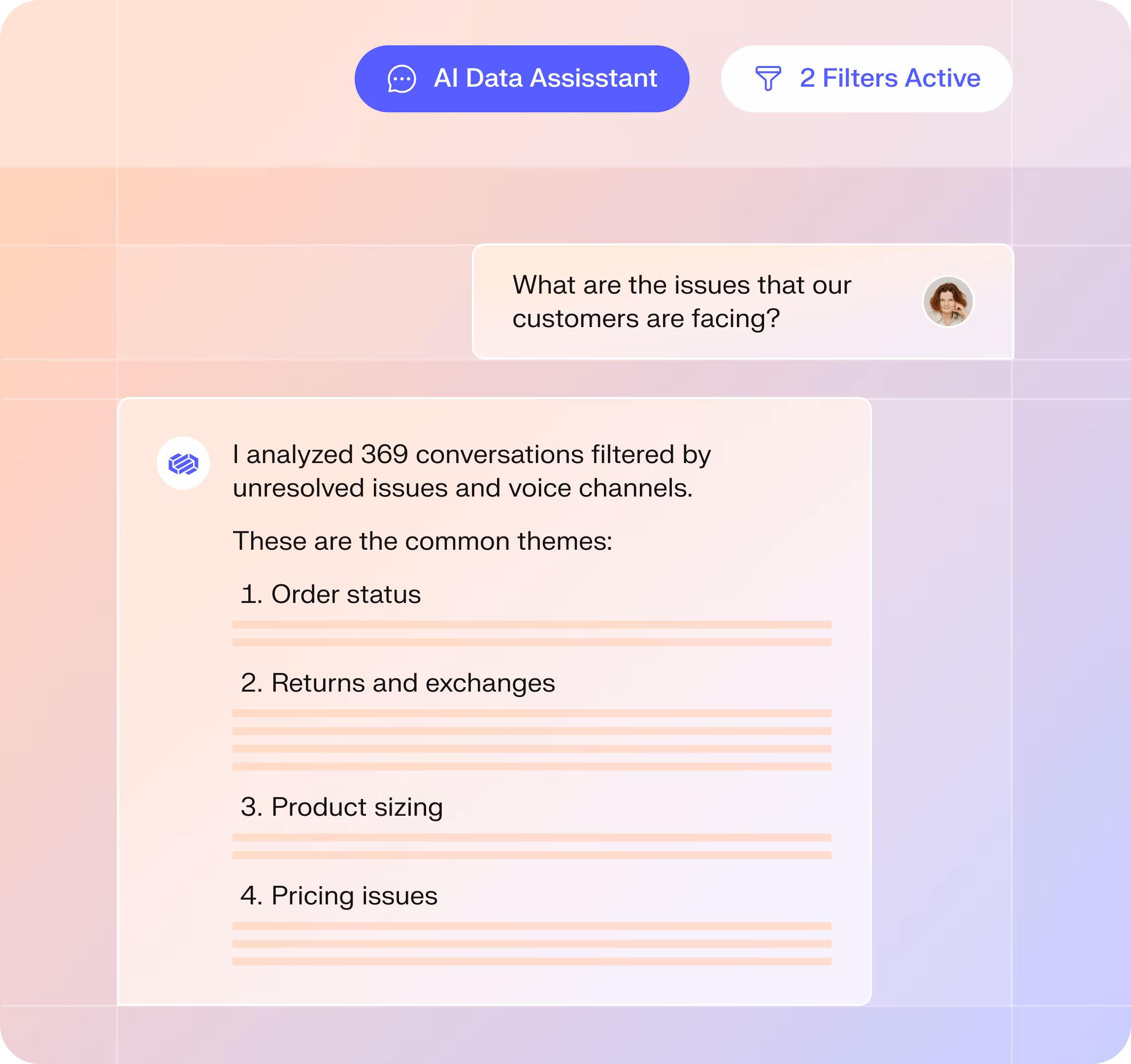 Ask open-ended questions like “Why are customers requesting refunds?” to instantly analyze customer conversations.