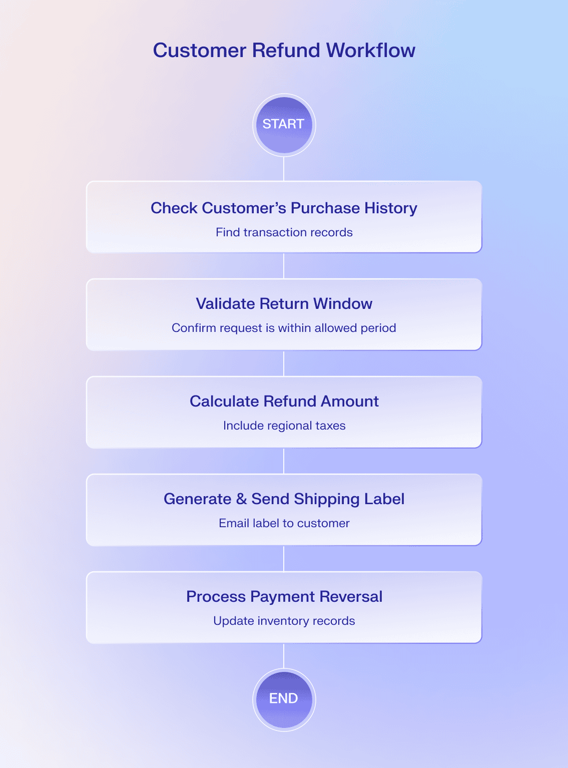 For instance, a single return request can trigger an AI agent to autonomously perform an entire sequence as follows: