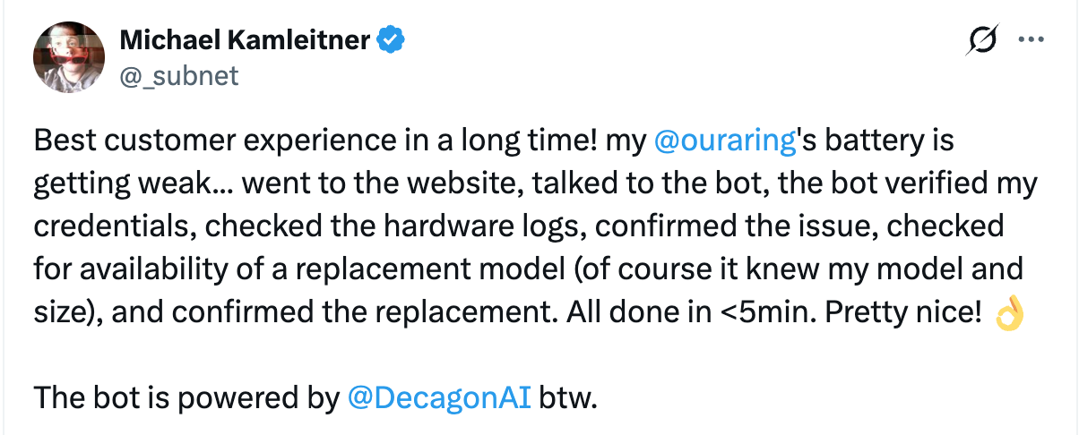 Decagon helps you do just that thanks to our unique Agent Operating Procedures. The end result is magic — just ask Michael, a loyal Oura Ring member:
